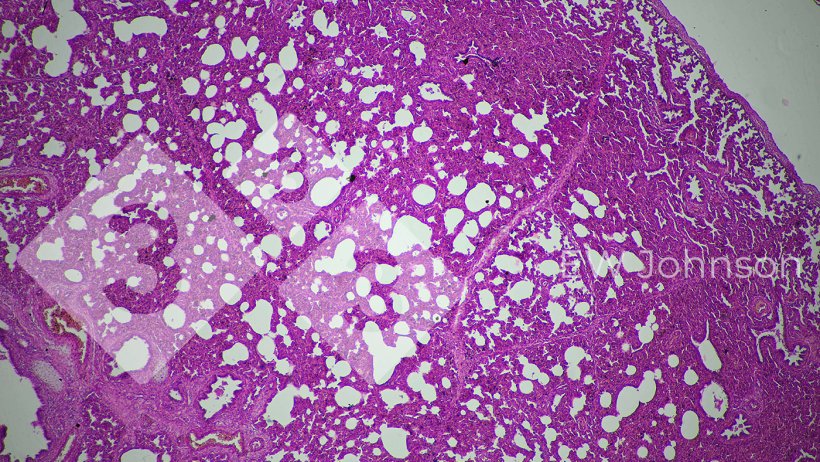 La PCR s'est révélée négative pour le SDRP, la pseudorage (PRV, maladie d'Aujeszky), les circovirus porcins PCV2 et PCV3, la peste porcine classique (PPC) et la peste porcine africaine (PPA). L'exploitation était connue pour être indemne de SDRP, de PRV, de peste porcine classique et de peste porcine africaine avant cet événement. La PCR pour le Getahvirus dans les poumons des porcelets s'est révélée hautement positive. L'histopathologie a révélé une pneumonie interstitielle sévère (figure 3) et une méningo-encéphalite fibrinohémorragique (figure 4). La maladie périnatale à virus Getah a été diagnostiquée. L'élevage a été informé que cette maladie est principalement transmise par les moustiques et des mesures de contrôle ont été mises en œuvre. Il n'y a pas eu d'autres cas ou signes cliniques dans l'élevage et la production est revenue à la normale.