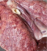 présence de sang dans les alvéoles. Desquamation et nécrose partielle de la muqueuse des bronchioles. Présence de nombreuses coupes de nématodes dans les alvéoles. |