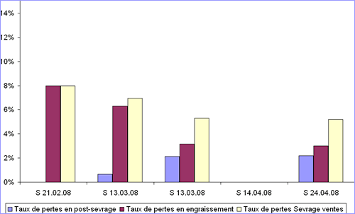 Cette dégradation des résultats du naissage se greffe sur une forte augmentation des taux de pertes en post-sevrage engraissement, entre 8 et 14% de pertes depuis deux ans, avec une dégradation du statut respiratoire très nette depuis août 2006. Plusieurs mesures déjà mises en place n'ont pas permis de réduire ces pertes.