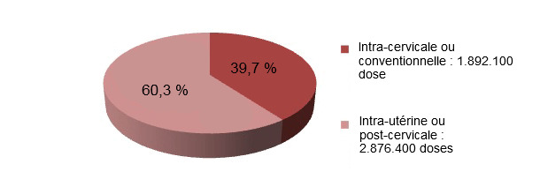 Le scénario le plus courant dans la filière porcine est un élevage de production inséminant avec de la semence réfrigérée. Dans ce schéma, l'intra-utérine est conventionnelle, au moins en Espagne, comme le démontre le fait que 60% des doses de semence commercialisées par les centres d'insémination durant l'année 2010 ont été employées pour l'insémination intra-utérine (figure 1).Cette réalité pose une autre question. Combien de spermatozoïdes doit-on utiliser par dose de semence réfrigérée pour l'insémination intra-utérine ?
