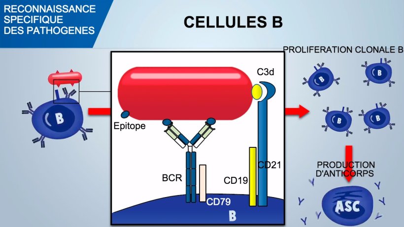 Les cellules B reconnaissent les déterminants antigéniques natifs de l'agent pathogène et le signal est transduit dans la cellule par l'activation d'une glycoprotéine associée (CD79α / β). Une fois le complexe antigène-BCR internalisé , les cellules B traitent l'antigène et le présentent en association avec le CMH aux lymphocytes T helpers. La costimulation entre les cellules B et T est essentielle pour l'activation des cellules B et pour déclencher une formation efficace des anticorps. Une costimulation efficace exige également un signal par la médiation d'un complexe CD21 /CD19 qui reconnaît le fragment de complément (C3d) sur l'agent pathogène.