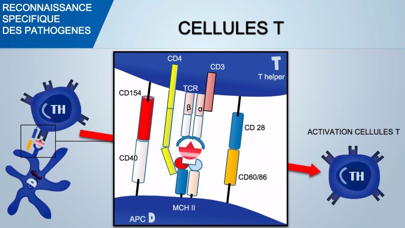 En revanche, les cellules T reconnaissent les déterminants d'antigènes traités et présentés par des APC en association avec le CMH (complexe majeur d'histocompatibilité).