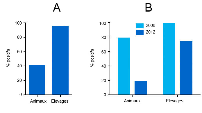 Figure 2. Anticorps contre le PCV2 dans le sérum des porcs d'engraissement en 2006 et 2012. A: Pourcentage des animaux positifs et des élevages positifs (contenant au moins un porc positif). B: Pourcentage des animaux et des élevages avec des anticorps contre le PCV2 induits par l'infection naturelle en 2006 et 2012.