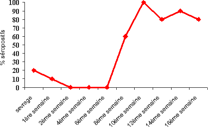 Le graphique 1 montre un groupe typique de porcs au fur et à mesure qu'ils croissent depuis le sevrage jusqu'à l'abattage dans un élevage classique en Europe. Le graphique mesure le pourcentage de porcs du groupe avec des niveaux sériques positifs d'anticorps pour l'iléite.