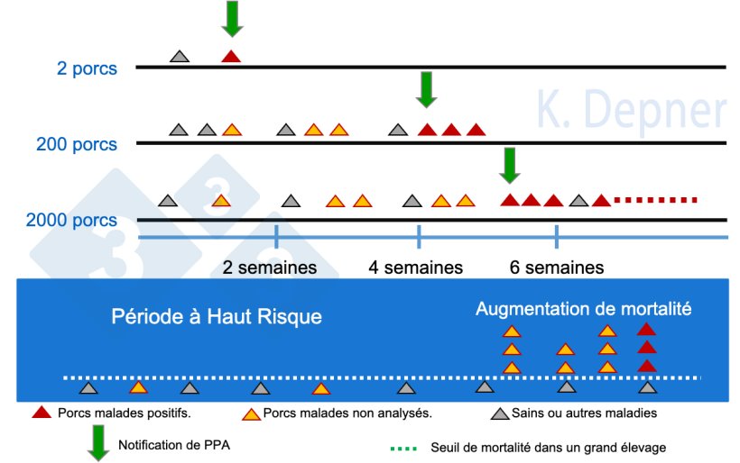 Imaginez ces deux scénarios : un petit éleveur avec deux porcs en trouve un mort en entrant dans l'enclos le matin. La mortalité dans ce cas est de 50%, et il est impossible de ne pas la détecter. Dans un autre grand élevage avec des milliers d'animaux, deux porcs meurent de PPA. La mortalité n'est pas encore alarmante et l'incident peut ne pas être détecté.