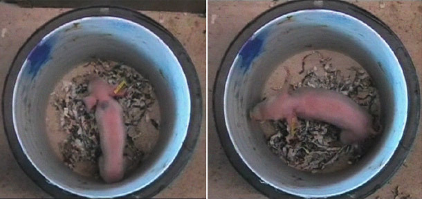 | Photo 1: détail d'un porcelet dans le récipient au début de l'essai de 30 secondes | Photo2: détail du même porcelet de la photo 1 en rotation dans le récipient (90 degrés de rotation vers la gauche) |