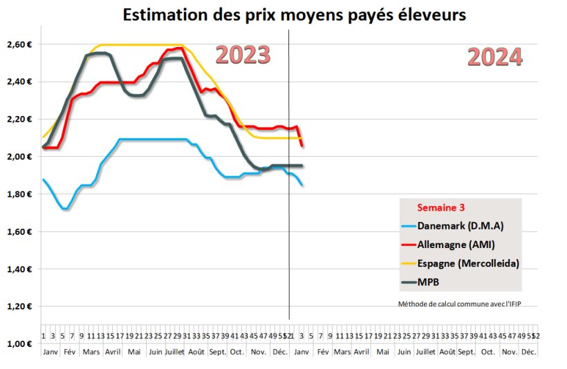 La pression s’accentue sur les marchés de l’offre notamment dans le nord de l’Europe en raison d’un excès d’offres difficile à réduire faute d’un commerce suffisant. Déjà, au cours de la deuxième semaine 2024, le Danemark avait réduit son prix d’acompte, le commerce étant perturbé par de mauvaises conditions météo. Aux Pays-Bas, l’abattoir Vion avait abaissé son prix de 6 cents dans un contexte de demande de viande extrêmement calme. La semaine dernière, la tendance baissière s’est étendue à l’Allemagne ainsi qu’à la Belgique dont le prix avait déjà enregistré une baisse en tout début d’année 2024. Le prix d’acompte danois enregistre une nouvelle baisse de 6 cents pour la semaine qui débute. L’Autriche annonce également un repli de 7 cents dans la mouvance allemande.