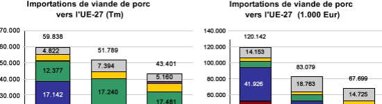 Six pays importent 71% du volume importé par l'UE-27. Dans les dix dernières années les importations allemandes ont augmenté de plus de 50% et ont marqué des différences avec l'Italie et le Royaume-Uni (Figure 1). La France et la Hollande sont les quatrième et cinquième pays en ce qui concerne les importations porcines. En sixième position, on trouve la Pologne. Malgré le fait que les importations étaient très réduites en 2002, dans les dix dernières années elles ont spectaculairement augmenté, arrivant ainsi à dépasser la France et la Hollande en 2011.