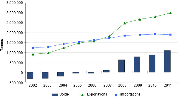 Graphique 1. Evolution du commerce extérieur de produits porcins en Allemagne entre 2002-2011. Donnée UE. Annuel. Juillet 2012.