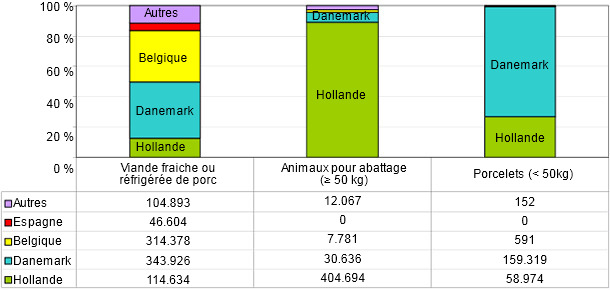 Pratiquement toutes les importations de produits porcins viennent de l'UE et principalement de Hollande, du Danemark et de Belgique qui représentaient 83 % du volume. Les pays d'origine des importations varient beaucoup en fonction des produits comme on peut le voir sur le graphique suivant. L'origine des animaux vivants est dominée par la Hollande et le Danemark alors que celle de la viande fraîche est un peu plus variée.
