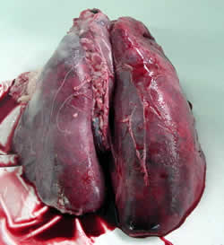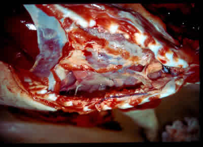 Lésions sur un total de 5 autopsies : - Rhinite marquée (atrophie des cornets): 4/5 - Pneumonie marquée (10/28): 4/5 - Pleurésie marquée: 3/5 - Abcès pulmonaires: 2/5 - Péricardite: 1/5 Bactériologie sur les lésions : 1. Lésions pulmonaires : Actinobacillus pleuropneumoniae B1 S7: 2/4 Pasteurella multocida non-toxinogène : 1/4 2. Cornets nasaux : Haemophilus parasuis: 2/4 Pasteurella multocida non toxinogène: 2/4 Actinobacillus pleuroneumoniae B1 S7: 1/4 Steptococcus suis (1-2): 1/4 |