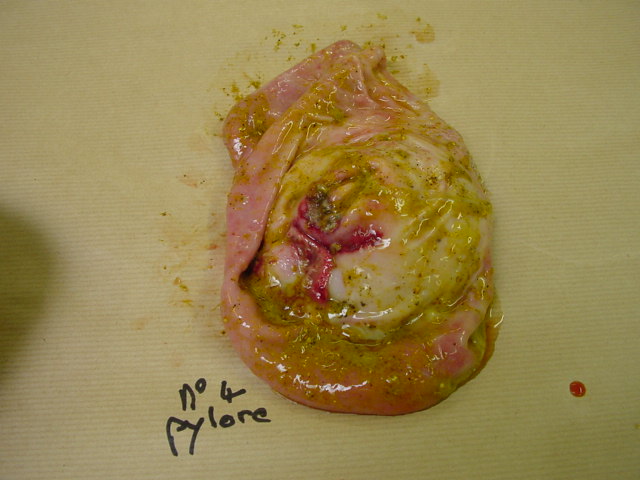 - forte congestion de la région du fundus et de la région du pylore. Ulcère du pylore sur un des sujets (photo 1)