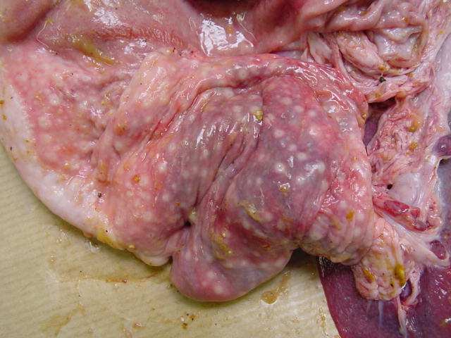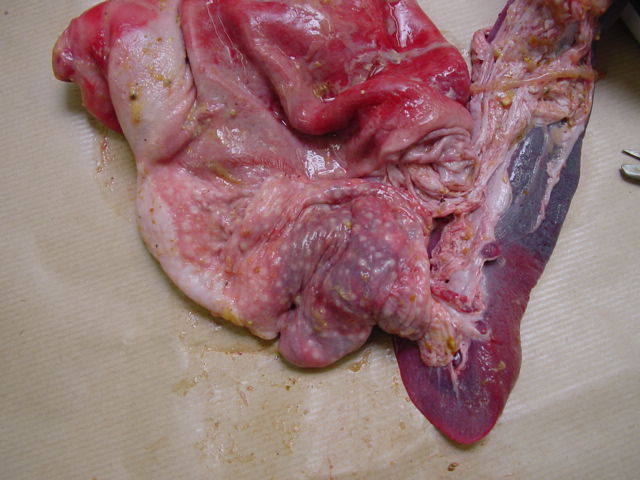 Le tableau lésionnel évoque surtout des lésions de gastroentérite. Les ulcères au niveau du pylore et l'hyper-réaction au niveau de la région glandulaire stomacale sont rares.