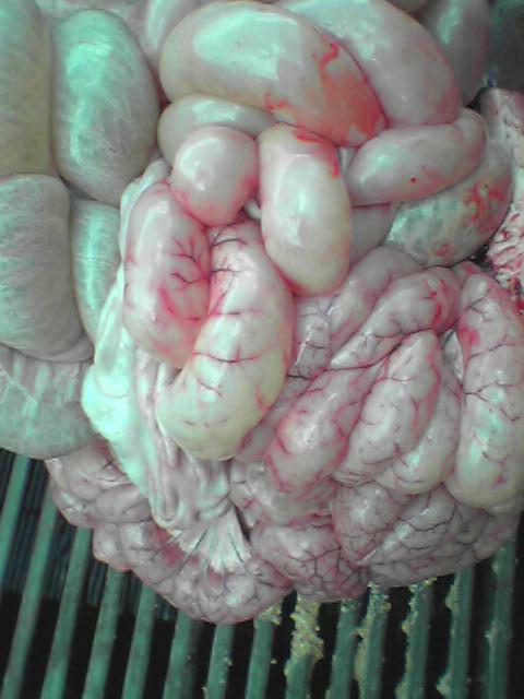 - Intestin grêle : contenu très liquide, forte réaction inflammatoire au niveau de la valvule iléocoecale (photo 5)
