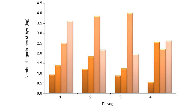 La méthode idéale pour le diagnostic reste encore l'isolement de M. hyopneumoniae, mais il n'est pas utilisé dans la pratique parce que c’est très difficile, cher et lent. Le diagnostic conclusif est souvent établi par la détection du (ou d’une partie du) pathogène par PCR, par détection antigénique par immunofluorescence ou par sérologie. Il existe plusieurs tests de PCR et on peut détecter M. hyopneumoniae sur des échantillons nasaux et trachéaux, des lavages broncho-alvéolaires (BAL) ou sur du tissu pulmonaire d'animaux morts. Les écouvillons nasaux sont faciles à prélever sur des animaux vivants mais les analyses sont moins sensibles que celles d'échantillons trachéaux ou de fluide de BAL. Vranckx et al. (2012) ont calculé la charge infectante sur des porcs de différents groupes d'âge dans 4 élevages distincts en utilisant la qPCR ou le fluide BAL (figure1). On a trouvé les valeurs les plus élevées dans les groupes les plus âgés. Les mêmes auteurs ont aussi démontré une corrélation positive sur des porcs à l’abattoir entre le nombre d'organismes de M. Hyopneumoniae, déterminés par la qPCR dans le fluide BAL et la sévérité des lésions pulmonaires. Le prélèvement de sang des différents groupes d'âge pour détecter des anticorps sériques permet la recherche sur un grand nombre de porcs et d'avoir une bonne vision du schéma d'infection. L'échantillonnage transversal (différents groupes d'âge pendant une visite à l'élevage) a l'avantage d'avoir des résultats rapides. D'autre part, les prélèvements de séries permettent d'analyser le même groupe de porcs au cours du temps et, par conséquent, on obtient plus d'information de la séquence d'infections dans ce groupe.