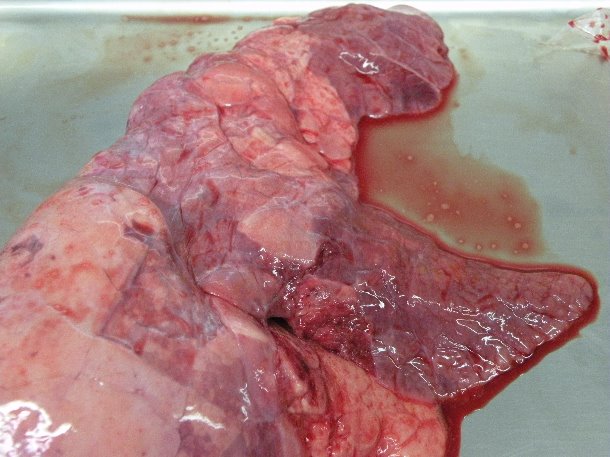 Le diagnostic de suspicion de la pneumonie par mycoplasme est basé sur les symptômes cliniques (toux chronique non productive avec faibles performances), la consolidation macroscopique typique de la zone cranio-ventrale du poumon (voir photo) et la présence, en histopathologie, des manchons et des nodules péri-bronchioliaires et péri-vasculaires caractéristiques. Cependant, ni les symptômes cliniques, ni les lésions pulmonaires ne sont pathognomoniques de M. Hyopneumoniae. De plus, les infections mixtes produisent souvent des symptômes et des lésions moins typiques de M. Hyopneumoniae.