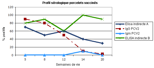 La réponse en IgG indique une évolution des anticorps d'origine maternelle et(ou) une séroconversion de courte durée après la vaccination. La réponse en IgM reste à des niveaux de base par l'absence d'infection. Les tests indirects se comportent de façon différente ; alors que A correspond à une immunité maternelle et une faible réponse au vaccin, à partir des 12 semaines, la B serait plus sensible indiquant mieux la réponse à la vaccination. Évidemment, ils mesurent des anticorps différents.