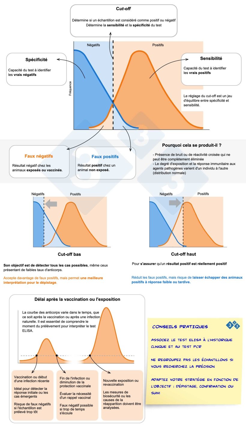 Le cut-off dans les tests ELISA influence directement la sensibilité et la spécificité du diagnostic. Le choix entre un cut-off plus élevé ou plus bas implique un équilibre et a un impact direct sur la détection des animaux positifs ou négatifs, ce qui influence les diagnostics, les stratégies de contrôle sanitaire et les mesures de biosécurité.