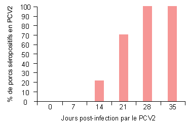 | Courbe de séroconversion de porcs infectés expérimentalement par le PCV2. Les anticorps anti-PCV2 ne sont pas détectés avant 14 jours post-infection. |