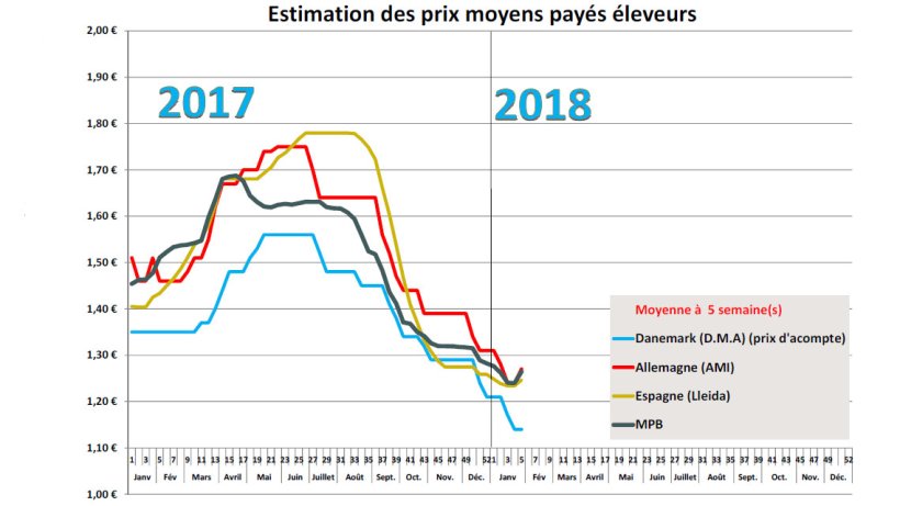 Les producteurs allemands ont donné le ton mercredi en affichant une hausse de 3 cents. En Allemagne, le marché s’équilibre petit à petit, les offres se réduisent et les abattoirs fonctionnent au maximum de leur capacité, profitant des bas prix pour congeler. Dans les semaines qui viennent, le déséquilibre offre / demande sera plus marqué par des disponibilités en porcs annoncées en repli. Les abattages des premières semaines de janvier ont été importants, dépassant le million de porcs hebdo, la progression de l’activité sur le mois de janvier avoisine les 2 % comparé à janvier 2017 (période où le marché était toutefois plus fluide par l’absence de fériés en fin 2016 et par une baisse importante des offres). Les poids poursuivent leur décrue semaine après semaine (‐ 600 g depuis la semaine n°1). Sur le marché de la viande, le commerce est variable selon les pièces, certaines entreprises préparant la prochaine saison de barbecue ; le changement de mois laisse envisager une meilleure demande dans les magasins.