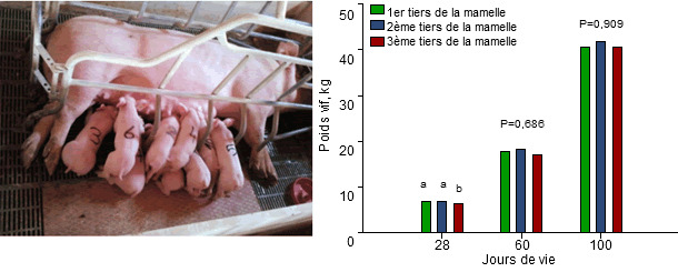 On a observé dans des études précédentes que chez les truies hyper prolifiques avec des lactations de 28 jours, les porcelets au meilleur poids vif (PV) au sevrage sont ceux qui présentent le plus de difficulté à se mettre à manger de l’aliment après le sevrage. De fait, on attribue à ces porcelets les mamelles les plus productives, même quand on réalise un bon programme d'adoptions. Les porcelets qui ont les moins bonnes mamelles productives avec un PV plus faible au sevrage ont souvent un meilleur taux de croissance au post-sevrage, égalant même celui de ceux qui au départ avaient un meilleur poids initial. Cette meilleure croissance serait liée à une meilleure adaptation et une meilleure performance d'utilisation de l'aliment pré-starter dû au contact précoce pendant la lactation (Solà-Oriol, 2011).