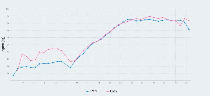 Le poids plus élevé des porcelets au sevrage dans le lot 2 pourrait être dû au fait que la consommation alimentaire plus élevée des truies dans les jours précédant la mise-bas, et plus tard au pic de lactation, a favorisé le développement des mamelles, et donc, la production de lait disponible pour les porcelets.