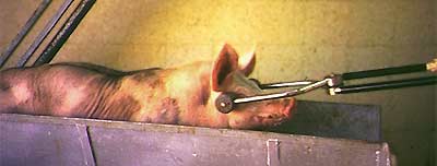 Maintenant, on ne saurait évoquer le contexte du bien être des porcs au cours de l’abattage sans évoquer aussi les méthodes d’euthanasie en élevage. Car, c’est une évidence, il y a parfois des animaux en élevage qu’il faut sacrifier compte tenu de leur état de santé. Encore faut-il savoir comment. L’électrocution fait partie des procédures autorisées par une directive européenne. P. Chevillon (ITP) a récemment fait le point sur ces procédures (Congrès ISAH 2004) S'il a confirmé la remarquable efficacité de l’électrocution (5 secondes sur la tête suivies de 15 au niveau du cœur), sa mise en œuvre en élevage est utopique au regard du coût de l’installation. Il ressort de ce travail que le matador est la meilleure solution pour des porcs de plus de 8 kg.