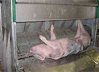 | Figure 2. L’étourdissement par inhalation de CO2 est rapide et, si réalisé de manière adéquate, dure suffisamment pour permettre que l’animal meure en ayant perdu tout son sang. |
