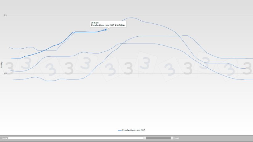 Depuis mi-mars, le prix espagnol est au-dessus du maximum atteint en 2015 et depuis début avril supérieur au maximum de l'année dernière. Et cela continue à la hausse… A ce niveau, il n'y a plus aucun doute sur le fait que le bilan de cet exercice –pour les éleveurs– sera excellent, pour ne pas dire merveilleux.