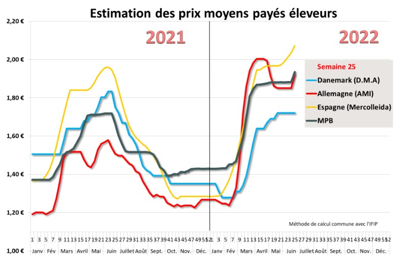 Le prix du porc en Chine poursuit sa progression. Le cours se situe à 18,21 CNY le 27 juin (2,58 euro). Selon un porte-parole du ministère chinois de l'agriculture (source lf (DK)), à la fin du mois de mai, le cheptel truies s'élevait à 41,92 millions, soit une augmentation de 0,4 % par rapport à la fin du mois d'avril, où le cheptel s'élevait à 41,77 millions, mais une diminution de 4,7 % par rapport à l'année dernière.