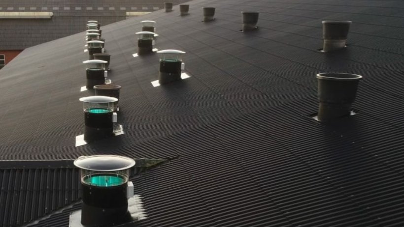 - Rayonnement UV : réduit ou élimine le risque d'entrée des infections aéroportées avant qu'elles ne pénètrent dans le bâtiment (Ruston et al., 2021). Le rayonnement UV est placé à l'entrée de l'air afin de détruire l'ADN et l'ARN des virus et des bactéries et de prévenir les infections. La technologie UV est principalement basée sur les UV-C d'une longueur d'onde de 200-280 nm et est utilisée dans l'industrie alimentaire pour la décontamination de l'eau, des aliments, des boissons, des surfaces, de l'air, etc. Certaines entreprises danoises spécialisées dans la ventilation ont mis au point des systèmes UV-C qui sont intégrés dans les entrées de ventilation et irradient l'air avant qu'il ne pénètre dans les élevages de porcs (figures 1 et 2).
