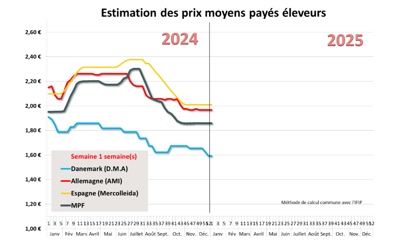 La semaine précédente, si les principaux marchés, à savoir l'Allemagne, l'Espagne et la France, étaient restés stables, certains pays du nord de l'Europe, comme le Danemark ou les Pays-Bas, avaient enregistré de légères baisses de prix. La semaine dernière, tous les pays ont affiché une stabilisation des prix, à l'exception de l'Italie, qui a connu une nouvelle baisse dans un contexte qui lui est propre. Cette apparente stabilité pourrait toutefois être remise en question dès cette deuxième semaine de l'année, les positions des principaux pays producteurs s'avérant déterminantes.