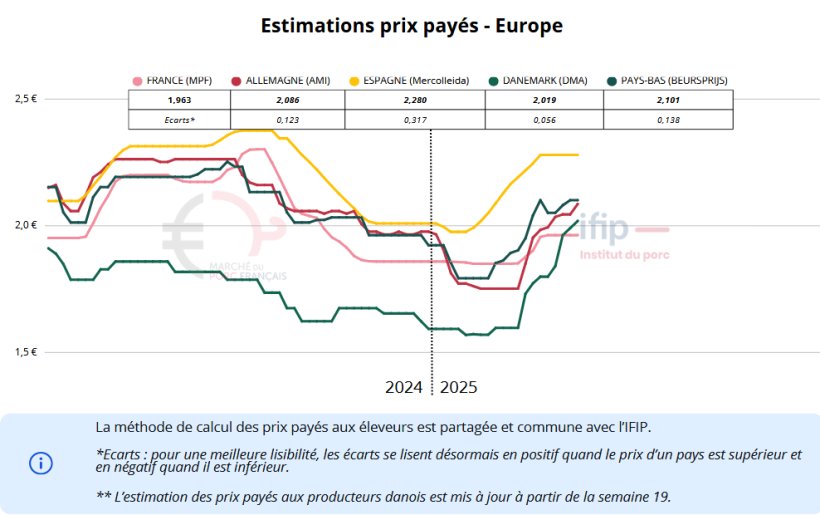 Le marché espagnol progresse de 0,5 centime en réaction à la hausse enregistrée en Allemagne. Néanmoins, largement en avance sur les autres pays européens, les opérateurs espagnols restent prudents, d’autant que les poids de carcasse demeurent très élevés, avec une légère hausse observée à nouveau la semaine précédente. En Espagne également, le problème réside dans l'absence de progression des prix sur le marché de la viande, ce qui resserre les marges des abatteurs. Par ailleurs, l’impulsion liée aux exportations semble désormais terminée.