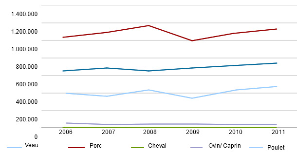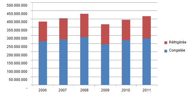 Depuis 2004, les importations de viande réfrigérée ont augmenté au détriment des viandes congelées. Depuis cette année, les importations de viande réfrigérée sont restées à environ 30%. En 2009, les importations de viande de porc ont chuté de 200.000 tonnes, et celle de poulet de 100.000 tonnes, alors que le veau a augmenté légèrement plus de 60.000 tonnes, soit 5% en un an, pour répondre à la demande de viande. Depuis ce temps, les importations de viande de porc n'ont pas augmenté.