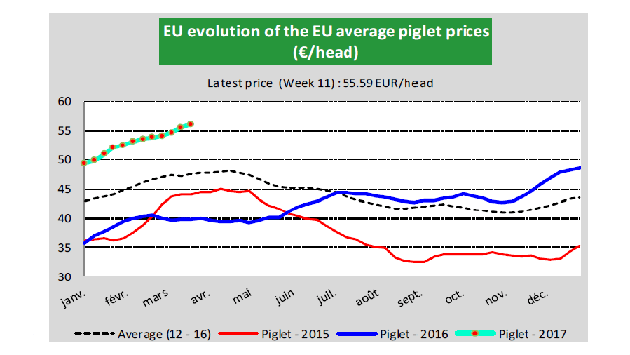 Les porcelets dont les prix avaient entamé leur hausse en novembre/décembre 2016 par manque d’offre, sont les porcs charcutiers mûrs pour l’abattage à partir de cette fin mars. De nombreux rapports font état de places vides en élevage et de retards de livraison des porcelets. Au regard des tarifs toujours à la hausse 4 mois plus tard, l’offre de porcelets ne semble pas se raffermir et présage d’un approvisionnement futur très serré pour les abattoirs qui influera certainement sur les prix à la production.