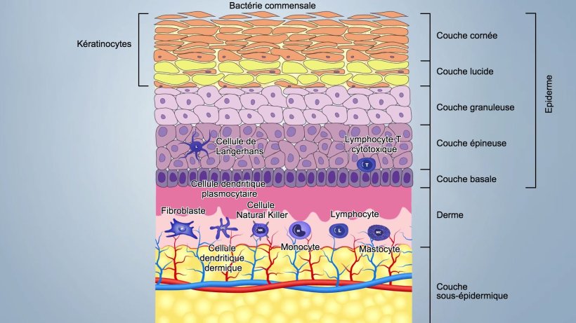 - L'épiderme (20-26 μm d'épaisseur), première barrière externe, où la desquamation continue des kératinocytes, la dessiccation, le pH bas, le sébum, les acides gras et les bactéries commensales (jusqu'à 1012 micro-organismes / m2), garantissent son intégrité et entravent la pénétration des pathogènes;
