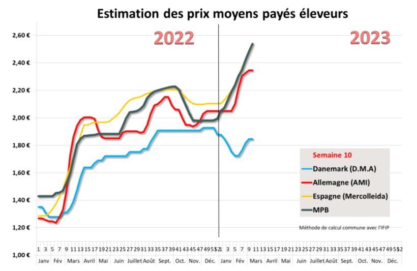 Le prix du porc au Marché du Porc Breton poursuit son ascension avec 6 centimes supplémentaires la semaine passée pour un cours qui s’établit à 2,366 euros. La séance de vente du lundi 6 mars s’était toutefois démarquée des séances précédentes puisque les abattoirs s’étaient vus refuser 1735 invendus avant d’enchérir au niveau de la vente obligatoire. Cependant, la vente du jeudi 9 mars a renoué avec les tendances des semaines précédentes et s’est terminée sur une hausse maximum de 5 centimes. L’activité sur la zone Uniporc Ouest s’est repliée de 8 939 porcs par rapport à la semaine précédente, conséquence probable des mouvements sociaux apparus en milieu de semaine. Les abattages n’ont pas dépassé les 346 990 porcs, en baisse significative de 9,7% par rapport à ceux de la même semaine 2022 (384 132 porcs). Malgré ce recul de l’activité, les poids ont baissé de 92 grammes à 95,78 kilos.