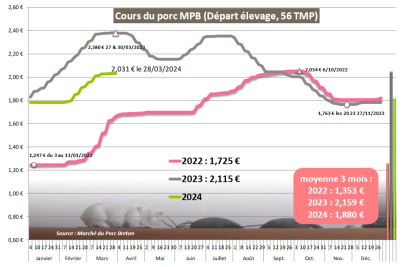 En Italie, l'offre de jambon en début de mois est plus élevée mais en même temps la demande des ménages est en hausse à l'occasion de Pâques. Ceci se traduit par un cours en légère hausse.
