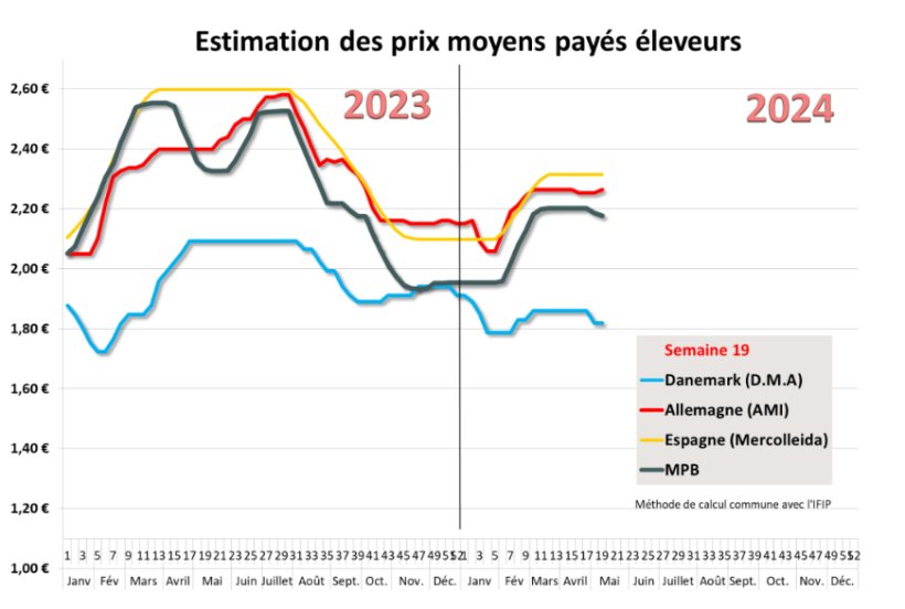 Au Marché du Porc Breton, les 2 séances hebdomadaires se sont tenues en début de semaine en raison des 2 fériés du 8 et 9 mai. Le cours s’est replié de 0,6 centime le lundi 6 mai et de 0,4 centime le mardi 7 mai. La baisse du cours tend donc à ralentir avec une amélioration de la demande sur le marché de la viande, stimulée par de meilleures conditions météorologiques durant cette semaine particulière où les 2 fériés ont été l’occasion pour beaucoup de français de prolonger le week-end. D’autre part, de nombreux abattoirs ont poursuivi leur activité le jeudi 9 mai (jour de l’Ascension) et les abattages de la semaine s’élèvent finalement à 281 091 porcs, les poids ont logiquement augmenté de 566 grammes pour s’établir à 96,61 kilos. Dans son communiqué du 7 mai 2024, Inaporc et toute la filière porcine se félicitent de l’accord signé avec la Chine qui va permettre d’exporter les abats blancs de porcs français vers la Chine (estomac et intestins…). Selon Inaporc, cet accord va prendre effet immédiatement sur les exportations et va générer une augmentation du chiffre d’affaires à l’export vers la Chine d’environ 10%.