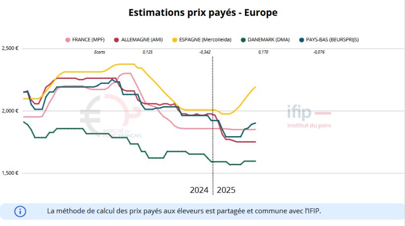 L’Espagne continue de progresser, mais avec une hausse limitée à 2,1 centimes. L’écart avec les autres pays européens restant conséquent, les acteurs ibériques attendent désormais qu’il se réduise avant d’envisager des augmentations plus marquées. Les poids d’abattage en Espagne restent élevés, avec des écarts supérieurs à 1,2 kg par rapport à 2024, mais les abatteurs n’ont pas d’autre choix que de les accepter dans un contexte de manque de porc. La demande extérieure pour les produits espagnols reste forte, notamment en provenance de la Chine, où elle continue de progresser.
