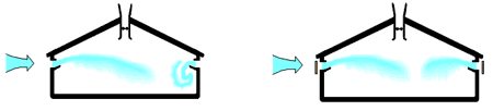 Un problème habituel dans des zones ventées est que la pression du vent est plus haute dans un côté du bâtiment que dans l'autre. Le résultat est que presque tout l'air de ventilation est apporté à travers les entrées qui sont du côté du vent et, dans le pire des cas sort par le côté opposé du bâtiment. La seule manière de corriger ce problème est d'installer un déflecteur le long du côté latéral du bâtiment, ce qui neutralisera la pression statique du vent.