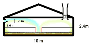 Une erreur fréquente lors d'une installation d'un système de ventilation dans un bâtiment est de ne pas prendre en considération la physique de l'air. Ainsi, quand l'air entre à travers une entrée, il est propagé sous forme de tourbillon et perd de la vitesse au fur et à mesure qu'il se déplace tandis qu'il se mélange avec l'air de l'intérieur. Par conséquent, on a donc besoin d'espace pour que le « nouvel » air de renouvellement entre suffisamment loin dans la salle comme il est indiqué sur la figure 4. Pour chaque mètre que pénètre l’air, 30 cm d'espace libre doivent être disponibles. Ceci signifie qu'un bâtiment de 10 mètres de large, avec une hauteur au plafond de 2,4 mètres et des séparations entre les cases d'1 mètre de hauteur, l'air pénétrera seulement les premiers 1.4/0.3 ~ 5 mètres avant d'arriver au sol ou à la surface du caillebotis. L'autre côté du bâtiment sera donc mal aéré. La solution la plus économique est d'installer des entrées d'air de chaque côté du bâtiment.