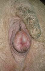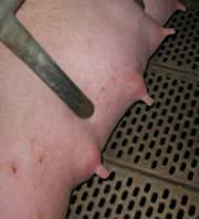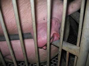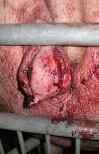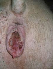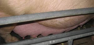 La vulve tuméfiée sera particulièrement fragile par l'affaiblissement des tissus, par conséquent si la cage est trop courte ou si la truie est trop grasse, elle court le risque d'avoir des lacérations. Ces blessures, étant dans une zone particulièrement sale, peuvent entraîner des processus suppuratifs et nécrotiques.