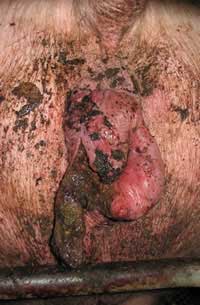 Blessure vulvaire déchirée, infectée et avec des tissus nécrosés