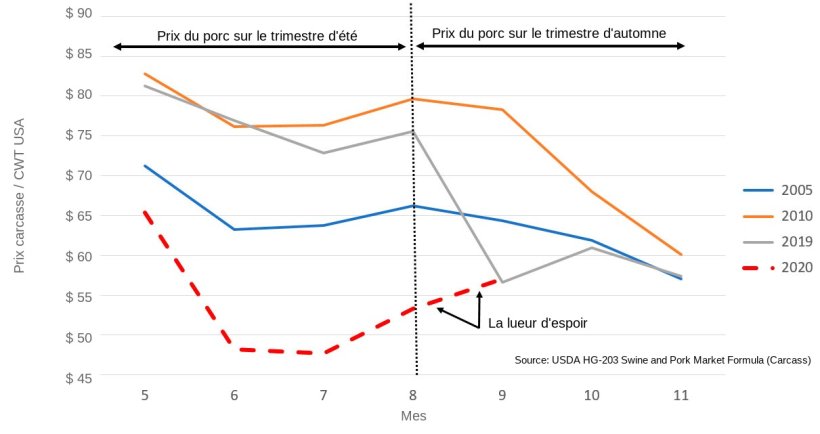 L'abattage des truies est constamment au-dessus de la ligne de tendance. En outre, la stratégie typique de vente et d'abandon de 5% des plus petits élevages des grandes entreprises a été mise en œuvre. Ceci, combiné à l'euthanasie d'un grand nombre d'animaux au poids du marché et les connaissances récemment acquises sur le ralentissement de la croissance avec des stratégies d'alimentation, a été un obstacle à l'énorme augmentation de la production prévue pour 2020. La carte cachée de ce jeu de poker peut cependant être l'euthanasie dont on parle peu des porcelets nouveau-nés il y a quelques mois lorsque leur prix est tombé pratiquement à zéro. Cela a créé un trou d'une ampleur inconnue dans le flux de la production américaine qui pourrait arriver juste à temps pour endiguer la baisse des prix pour le trimestre d'automne. Les parcs d'engraissement vidés par les porcs euthanasiés étant en cours de remplissage, les abattoirs ont dû soumissionner pour des porcs de marché ces derniers jours.