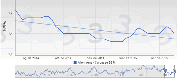 Au cours des quatre dernières semaines, l'Allemagne (toujours l'Allemagne !) a réalisé les mouvements suivants : + 5, +5, -3, -7 centimes par kilo en carcasse, ce qui fait que le prix est finalement revenu à son point de départ. Il semble que le marché ait augmenté surtout en raison de l'insuffisance de l'offre et, face à l'impossibilité de répercuter la hausse du porc à la viande, est revenu où il en était.