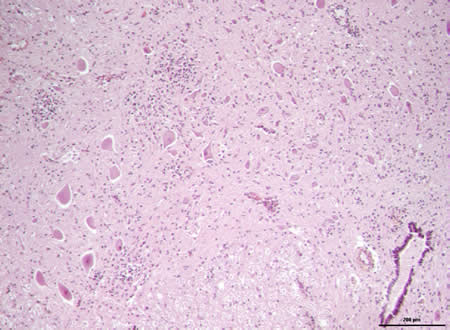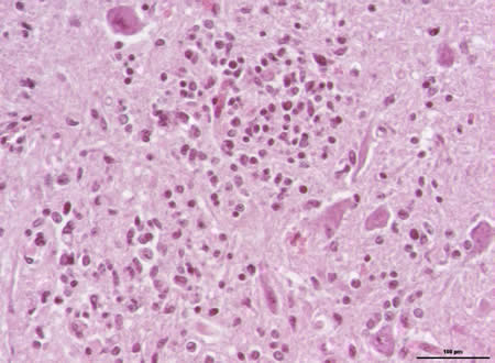 Des prélèvements de cerveau et de moëlle épinière sont adressés pour histologie.