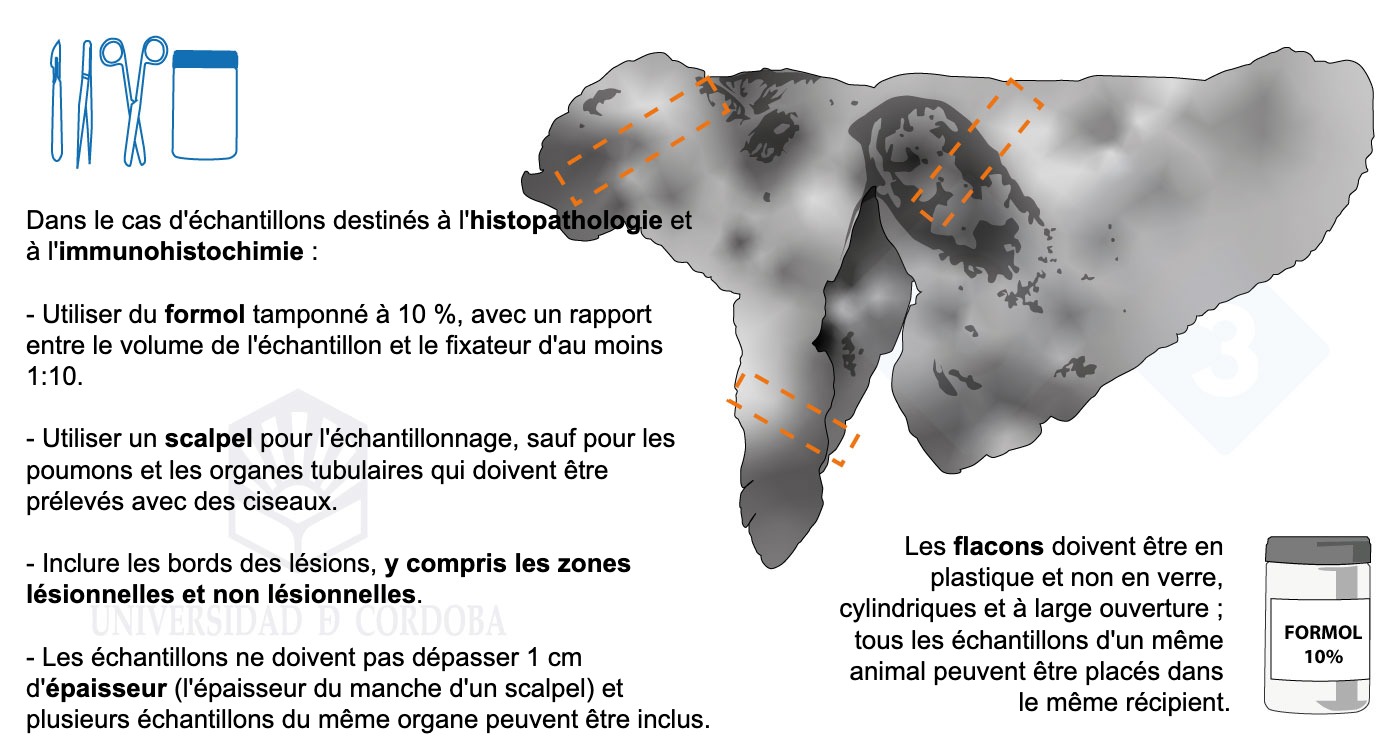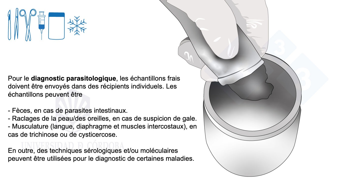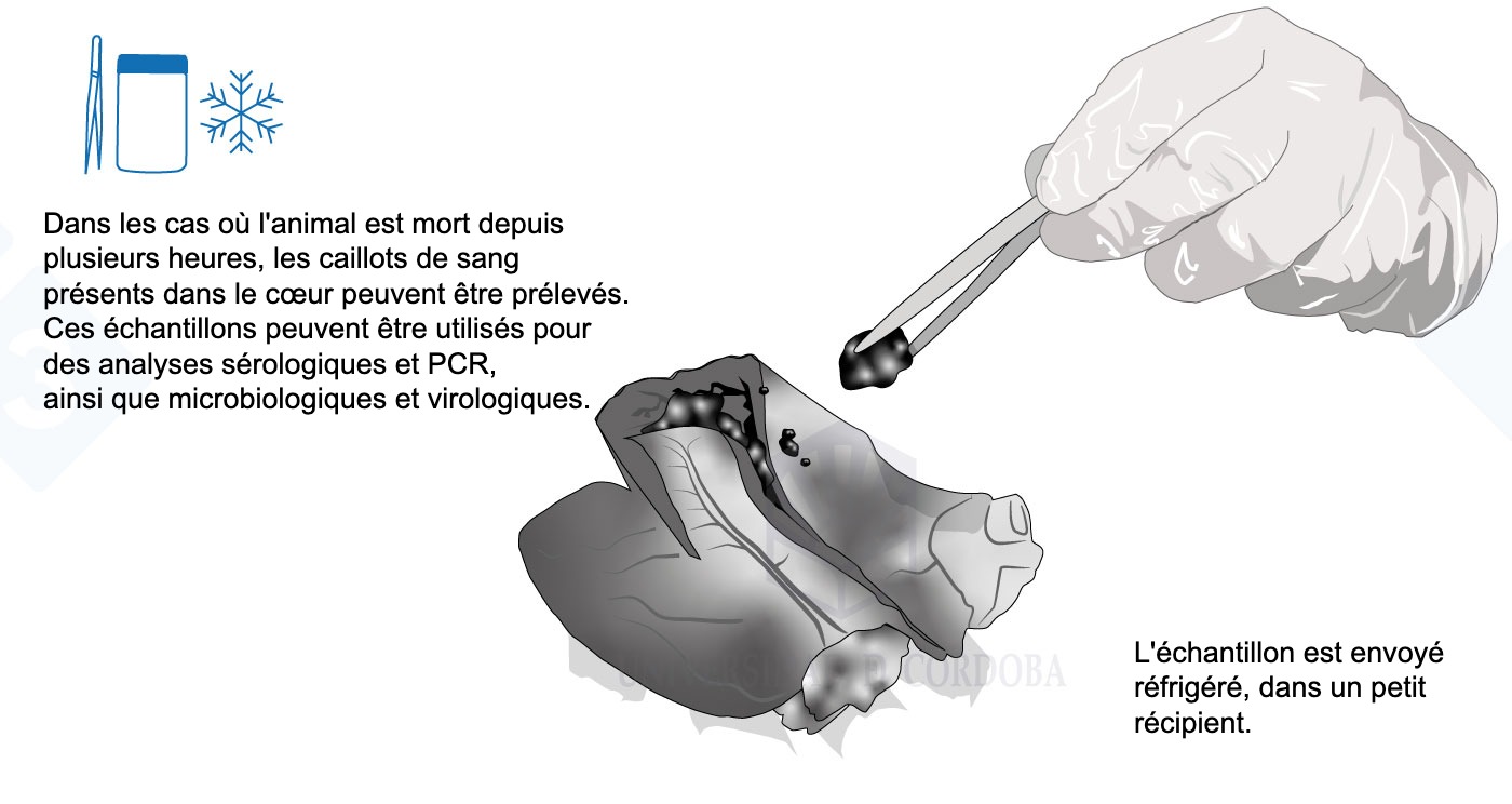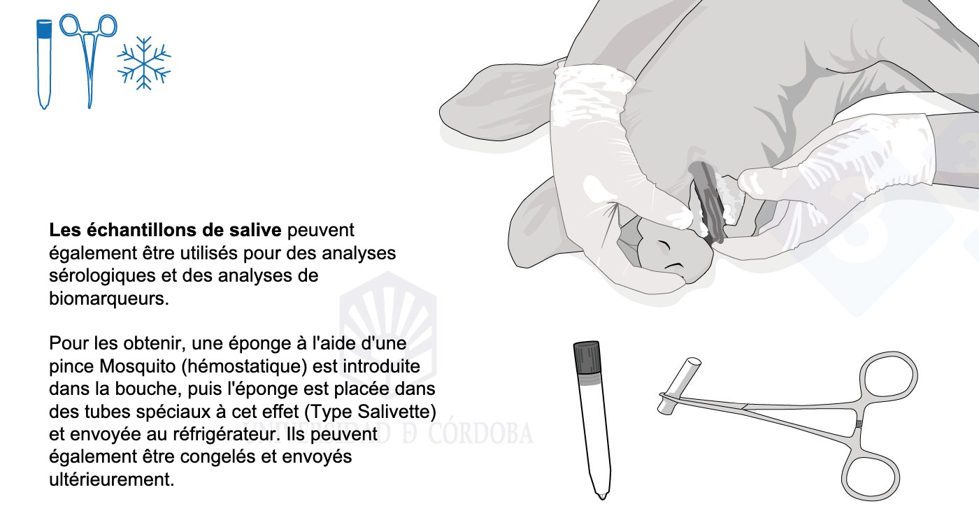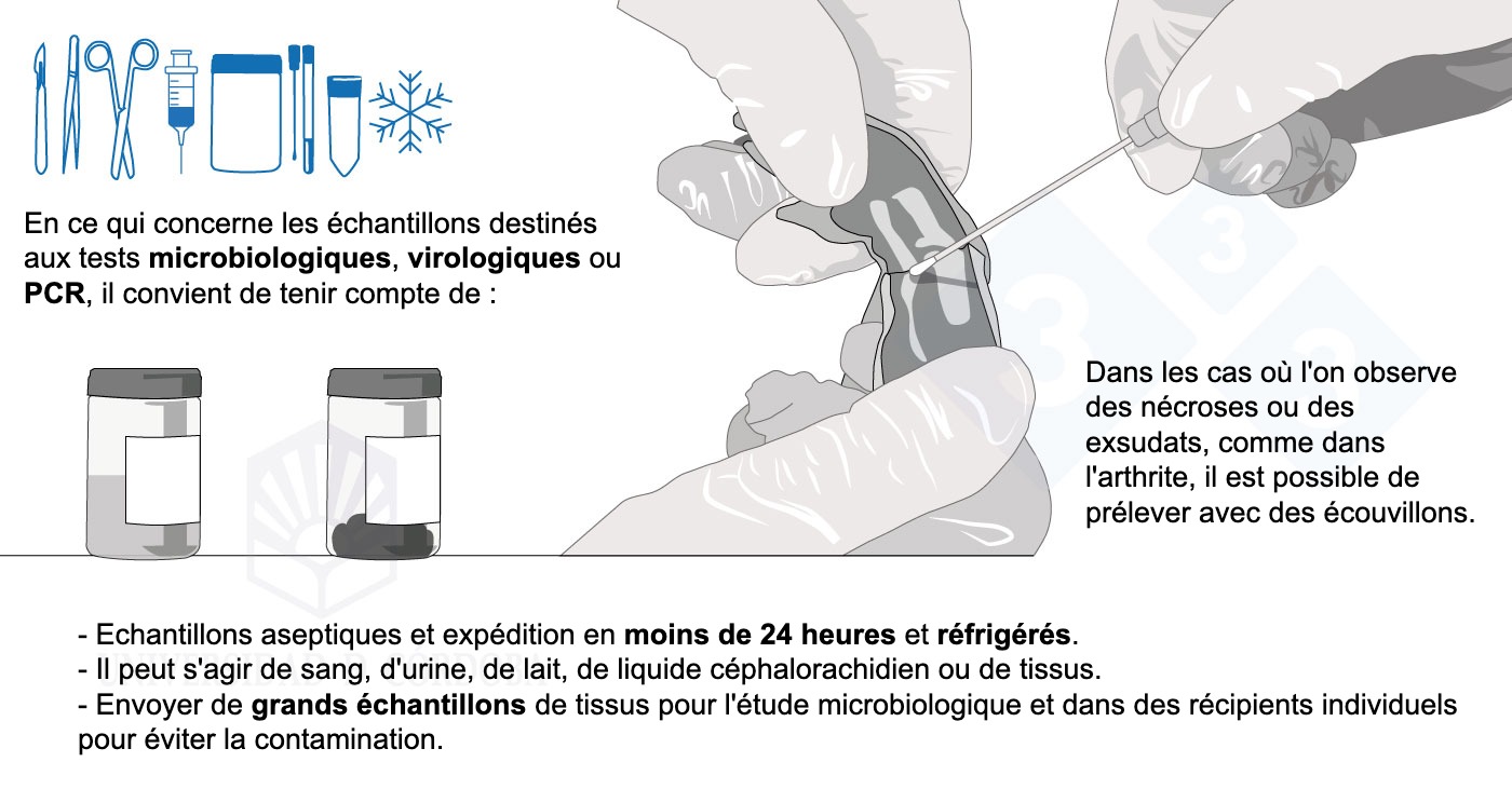 Dans cette dernière partie du manuel, nous détaillons certains aspects intéressants pour le prélèvement d'échantillons de sang ou de caillots sanguins, de salive, d'histopathologie, d'exsudats, de fèces ou d'urine. Nous apprendrons quelles sont les zones les plus appropriées pour le prélèvement de chaque échantillon, comment le faire, avec quels instruments, la quantité nécessaire et comment l'envoyer au laboratoire.