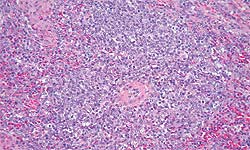 Déplétion lymphocytaire modérée et infiltration histiocytaire du tissu lymphoïde. Coloration HE (hématoxilline-éosine). (Photo cédée par le Dr. Edward G. Clark, Prairie Diagnostic Services, Canada) |