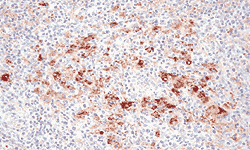 Quantité modéré de génome de circovirus porcin de type 2 - Immunohistochimie (Photo cédée par le Dr. Edward G. Clark, Prairie Diagnostic Services, Canada) |